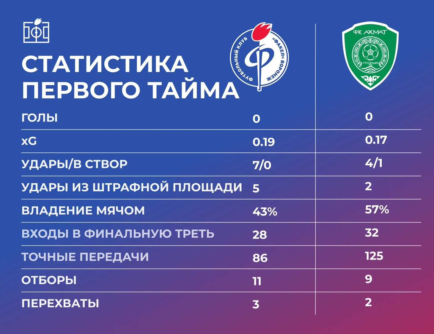 Судя по статистике, второй тайм стал для игроков «Ахмата» значительно успешнее первого, однако своевременная реакция тренерского штаба, концентрация команды и грамотный матч-менеджмент позволили «Факелу» прервать серию из пяти поражений подряд.