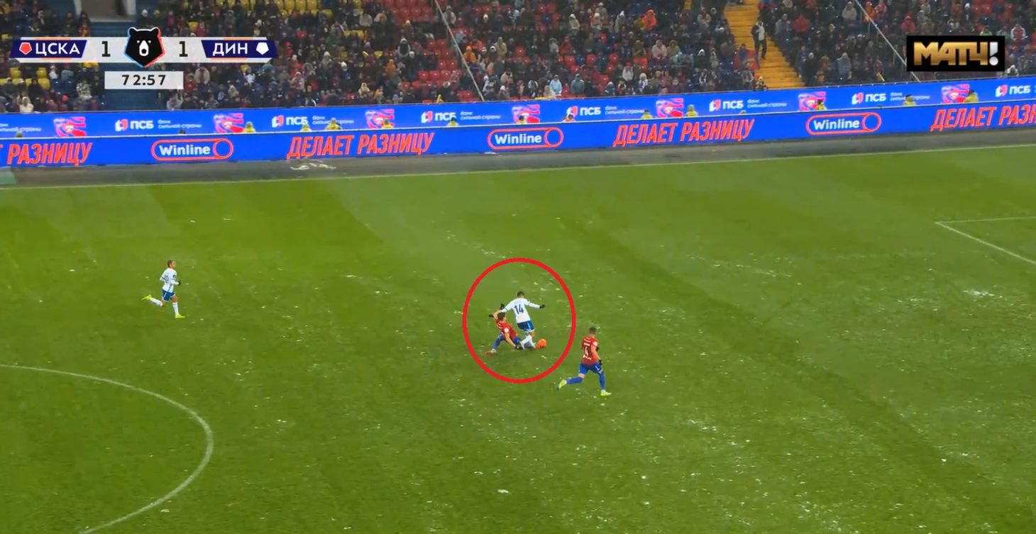 Упомянутый момент с Эль-Мехди Маухубом, вероятно, относится к эпизоду на 74-й минуте. Игорь Дивеев и Виллиан Роша сопровождали Маухуба, а подкат Дивеева привел к падению форварда «Динамо» и желтой карточке россиянину.