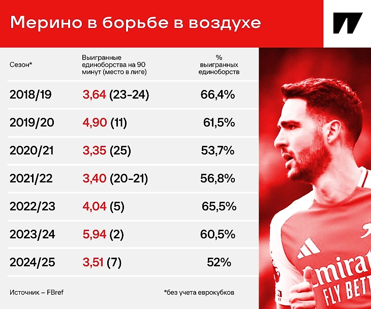 Сейчас показатели чуть скромнее, но Мерино все равно оказался в топ-10 АПЛ. Не зря Киран Тирни называл его «дуэльным монстром».