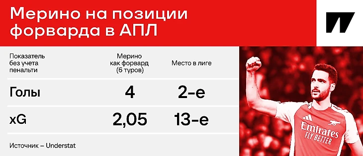 Вводные делают эксперимент с Мерино в роли форварда как минимум интересными. Все-таки Микель стал одним лучших по голам в АПЛ в этот период и уже обновил собственный рекорд.