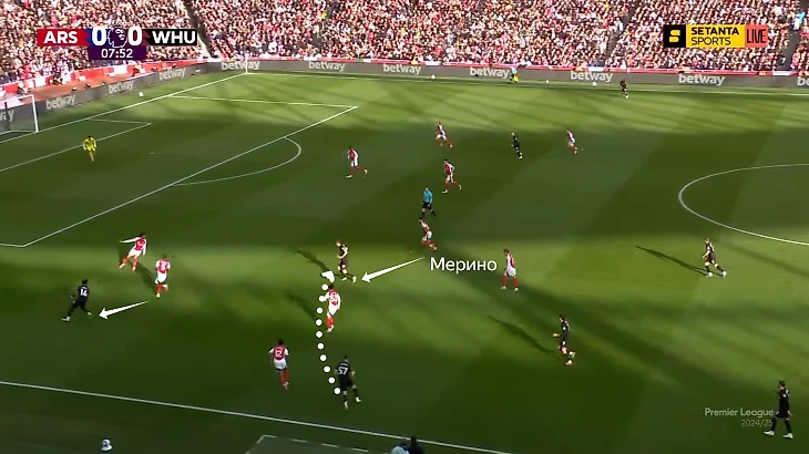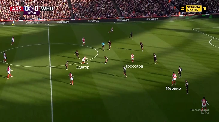 Против «Вест Хэма» (0:1) Эдегор опустился для розыгрыша, а место форварда занял Леандро Троссард. Мерино сместился правее и занял позицию норвежца. В итоге через 15 секунд испанец открылся на дальней штанге под навес и скинул мяч в центр штрафной.