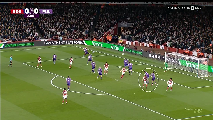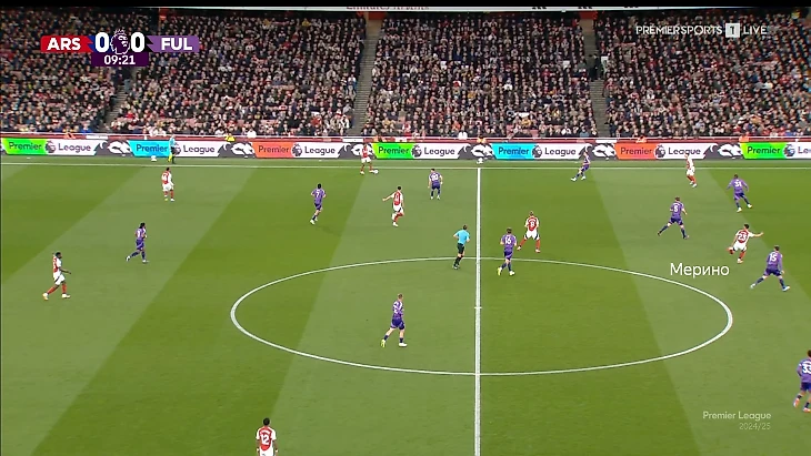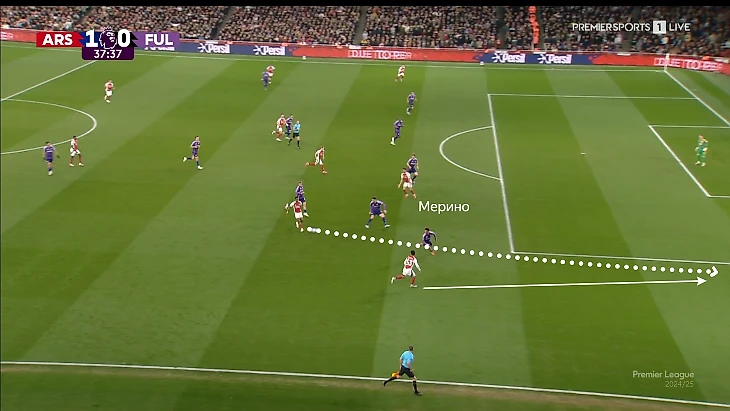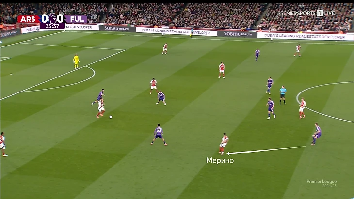 Против «Фулхэма» Мерино в одной из атак опекал Хорхе Куэнка, но латераль Энтони Робинсон излишне сместился в центр ему на помощь и не оглядывался на Итана Нванери за спиной. В теории точный навес Габи Мартинелли на дальнюю штангу мог привести к опасному моменту.