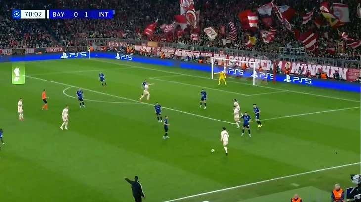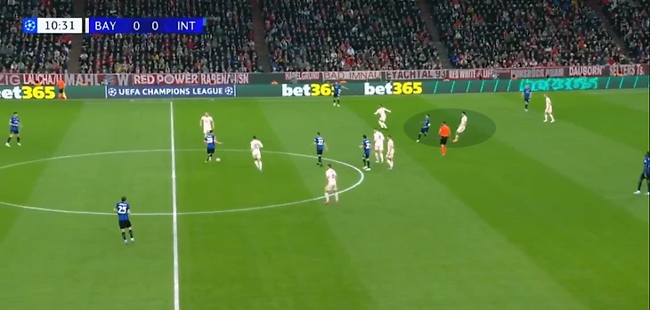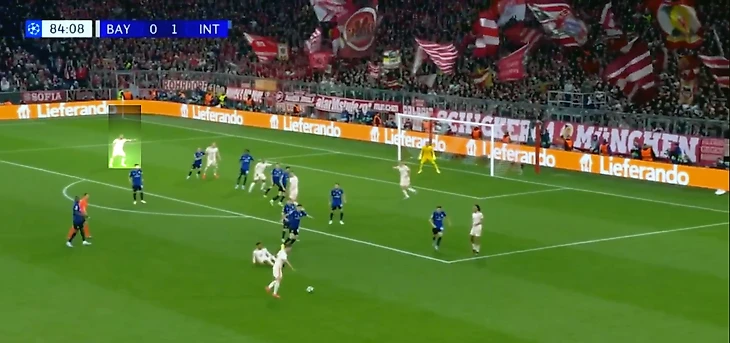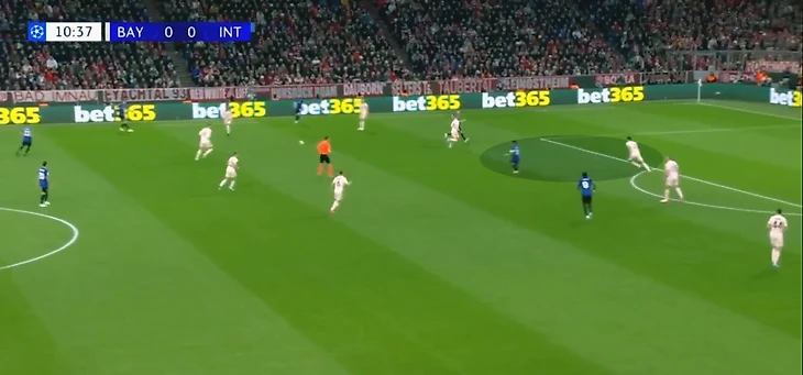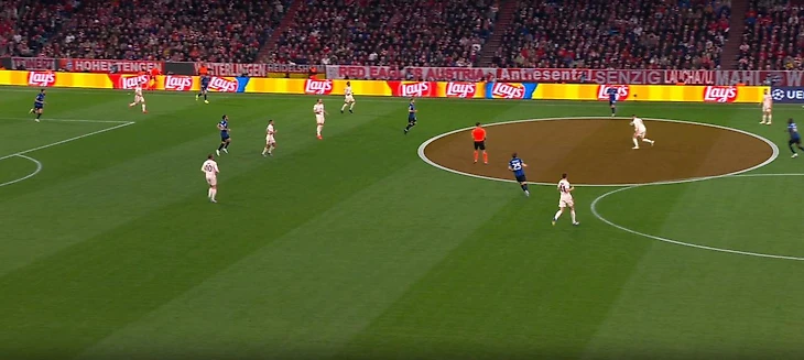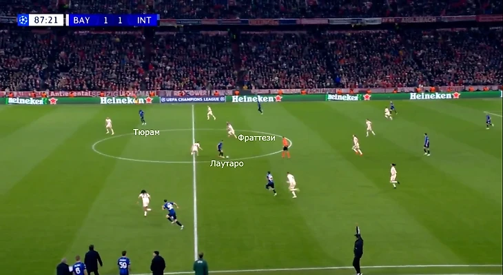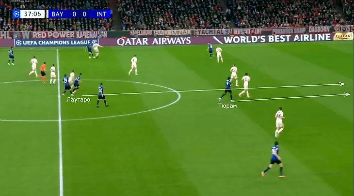 «Интер» открыл счет после заброса швейцарца. Все центральные полузащитники «Интера» были глубоко при забросе Зоммера, увели соперников, чтобы создать удобные 2-в-2 Тюраму и Мартинесу против центральных защитников «Баварии».