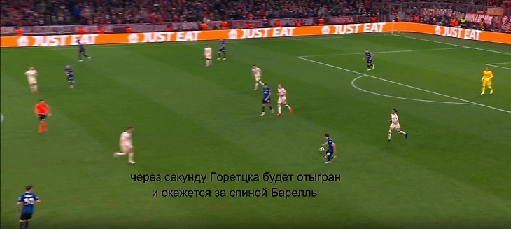 Дальше Станишич, передвинутый после замен в центр защиты, недостаточно плотно сыграл с Лаутаро, Саша Боэ вместо игры по Карлосу Аугусто побежал подчищать за Горетцкой, который из-за полупозиции уже был за спиной Бареллы, в то же время свежий Давиде Фраттези оторвался от Киммиха, его за 88 минут извел Барелла.
