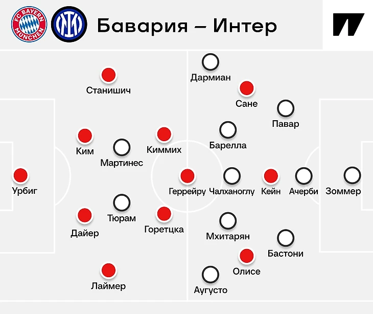 «Бавария» незадолго до «Интера» потеряла из-за травм Мануэля Нойера, Дайо Упамекано, Альфонсо Дэвиса, Хироки Ито, Джамала Мусиалу, Кингсли Комана. Давно из-за мононуклеоза нет Алекса Павловича. Вполне ожидаемый состав с учетом повреждений, единственный относительный сюрприз – Рафа Геррейру в роли десятки. Впрочем, Геррейру пару раз появлялся под нападающим в этом сезоне, против «Бохума» в марте сделал дубль. Томас Мюллер остался в запасе даже без Мусиалы в заявке.