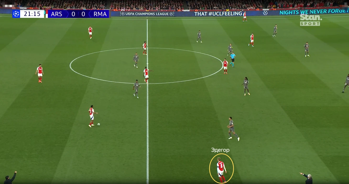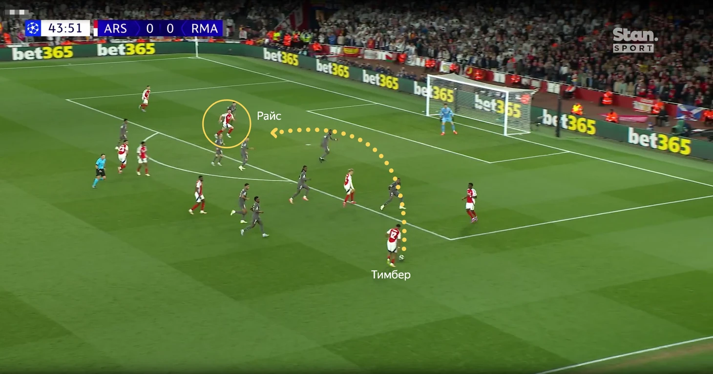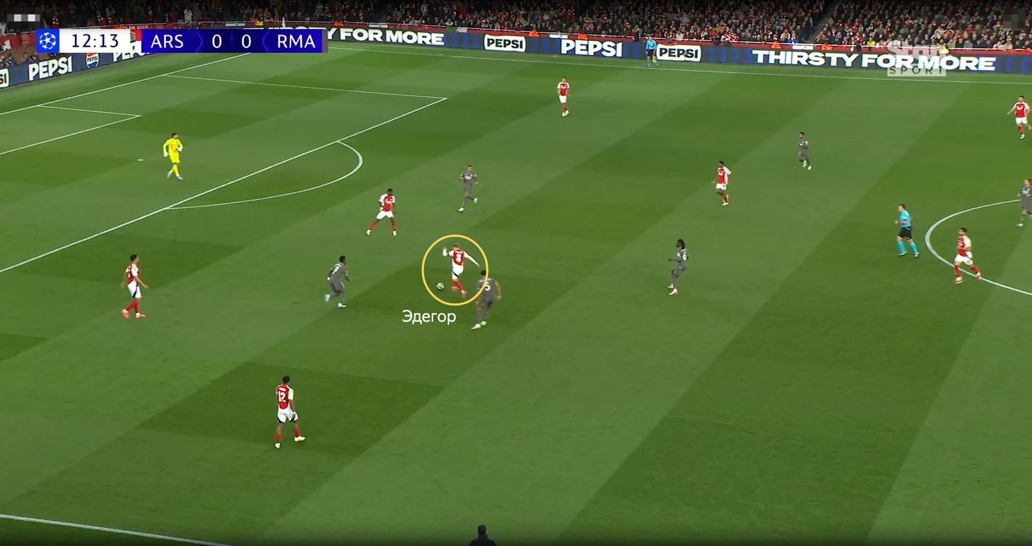 Здесь открылся внутри прессингующей группы игроков «Реала» и помог «Арсеналу» выйти в атаку через свободную зону на фланге.
