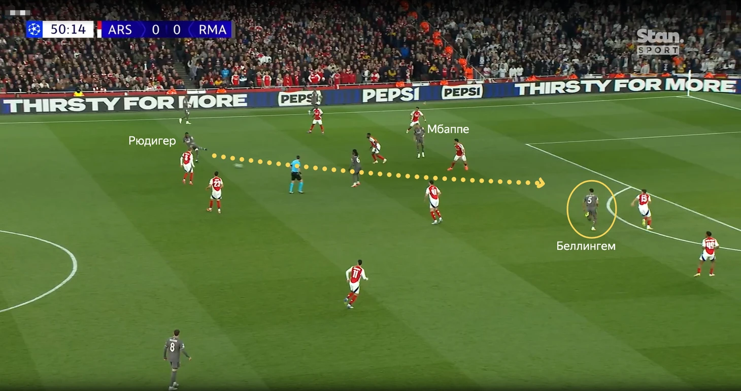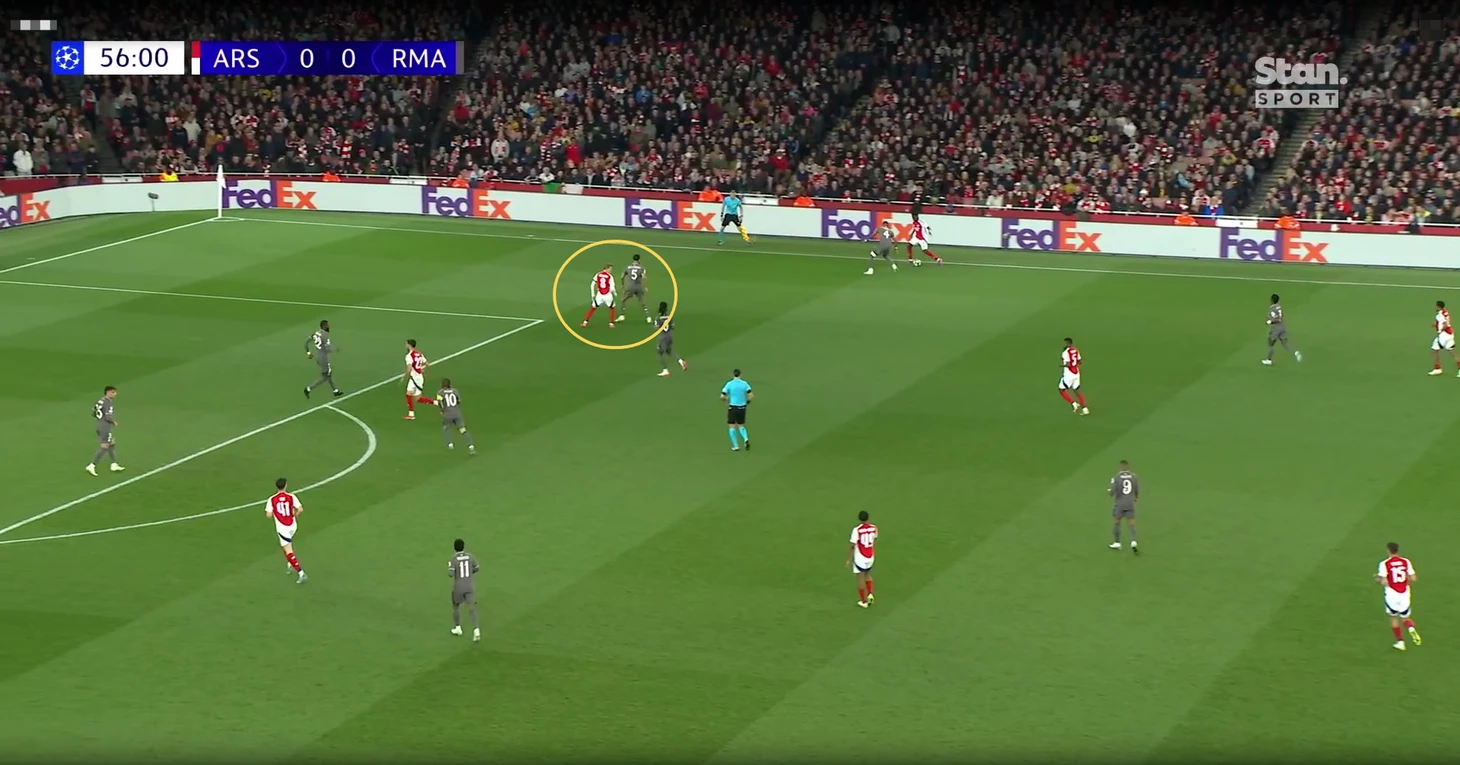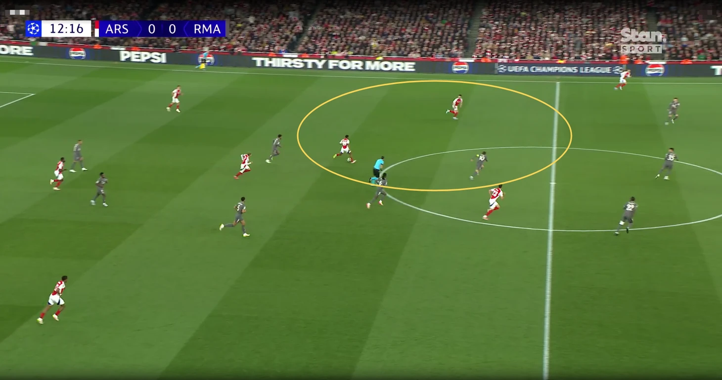 Здесь открылся внутри прессингующей группы игроков «Реала» и помог «Арсеналу» выйти в атаку через свободную зону на фланге.