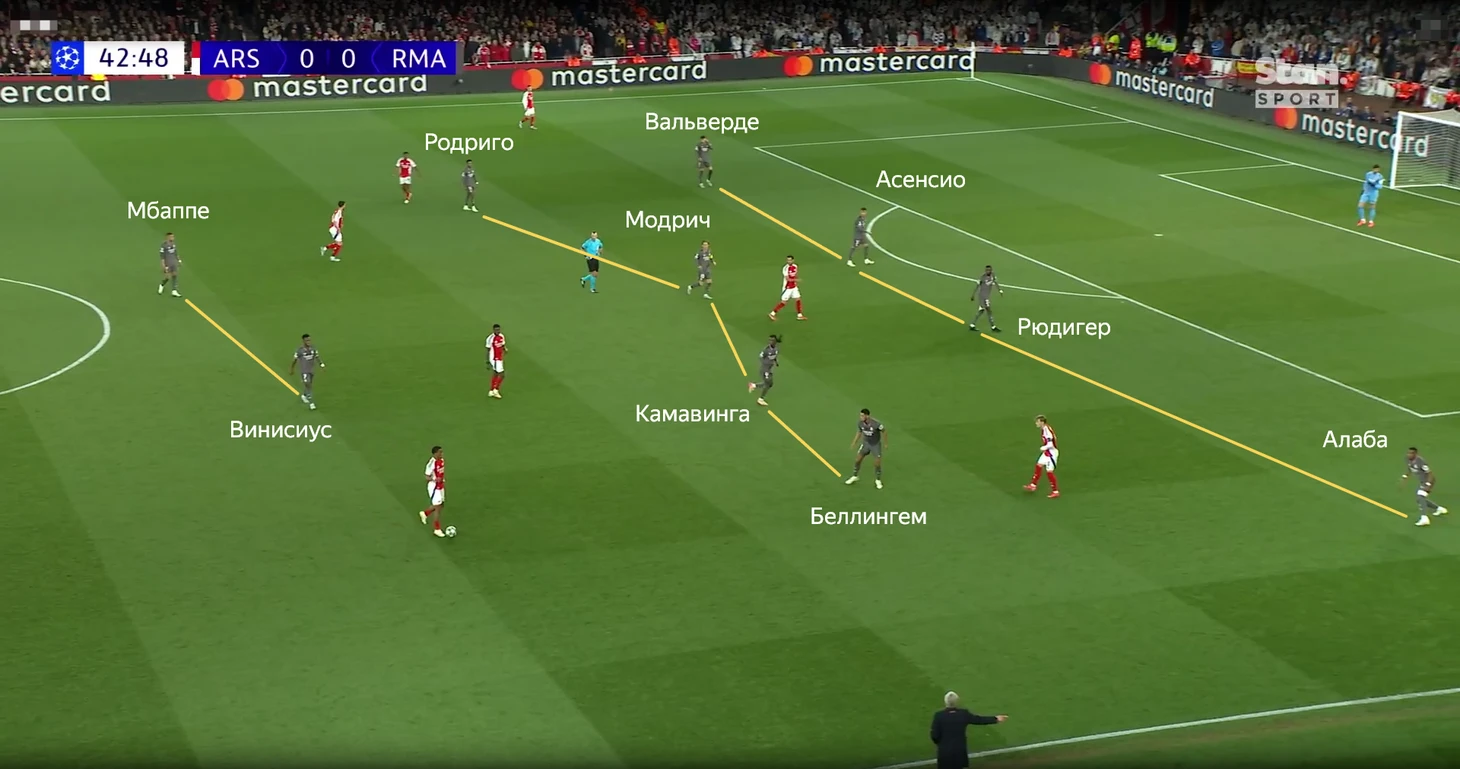 Поэтому изначально игроки «Арсенала» располагались в выжидательном блоке в схеме 4-4-2. При этом ситуативно могли включаться и оказывать давление на игроков «Реала» в начальной стадии атаки. Из-за этого у гостей нередко возникали сложности с продвижением: только 26% атака, которые начались от ворот, дошли до половины поля соперника.