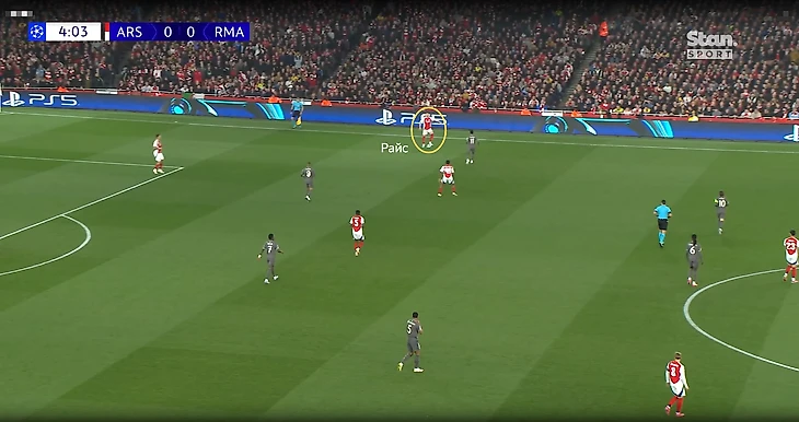 Микель привычно вместе с Райсом атаковал штрафную рывками и путали соперника своими взаимными перемещениями. Например, здесь под подачу в штрафную открылся именно Деклан.