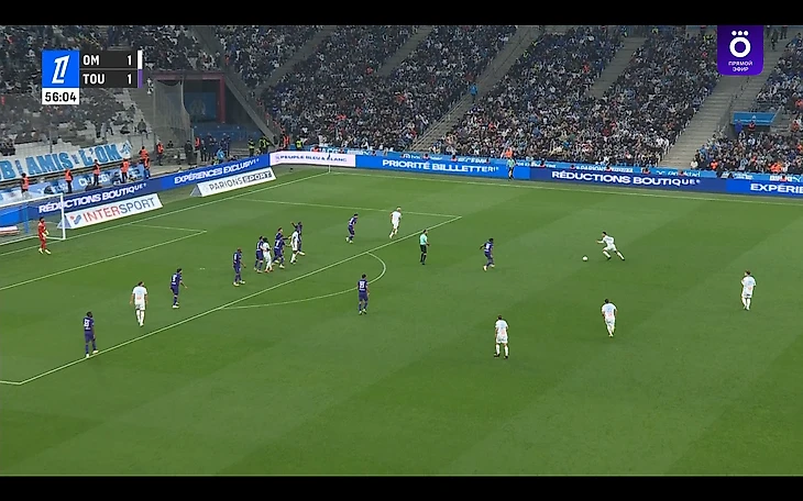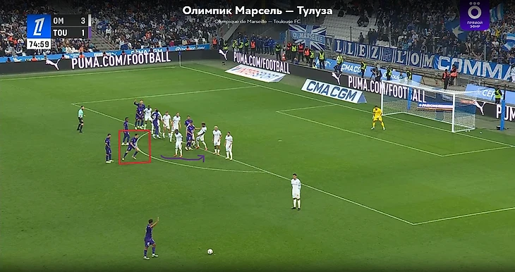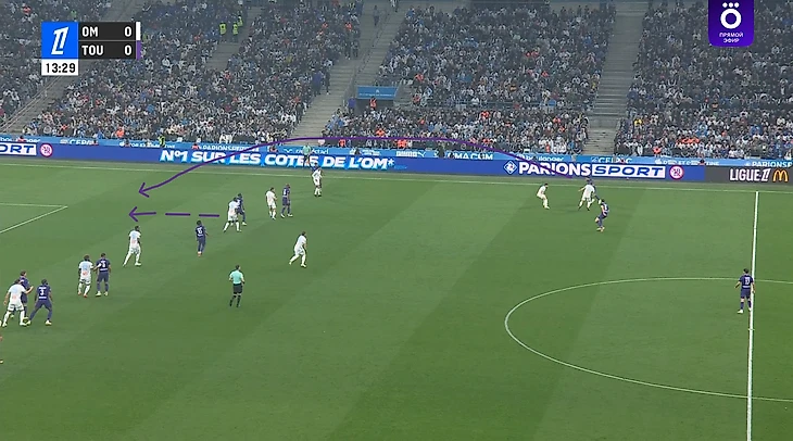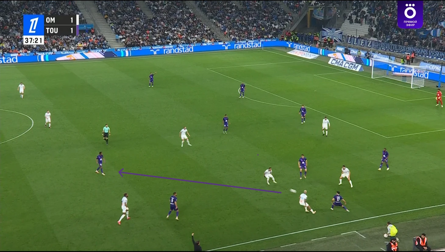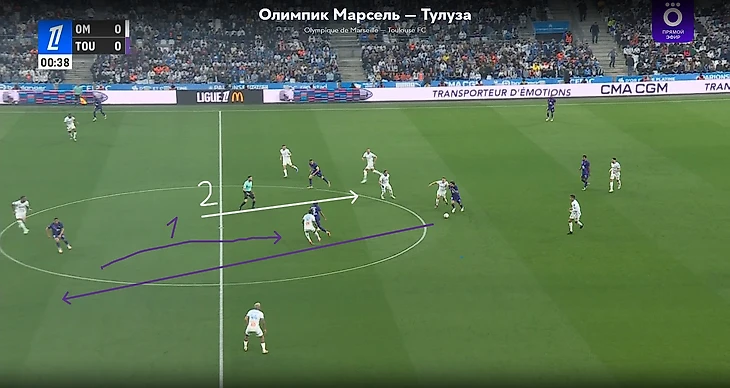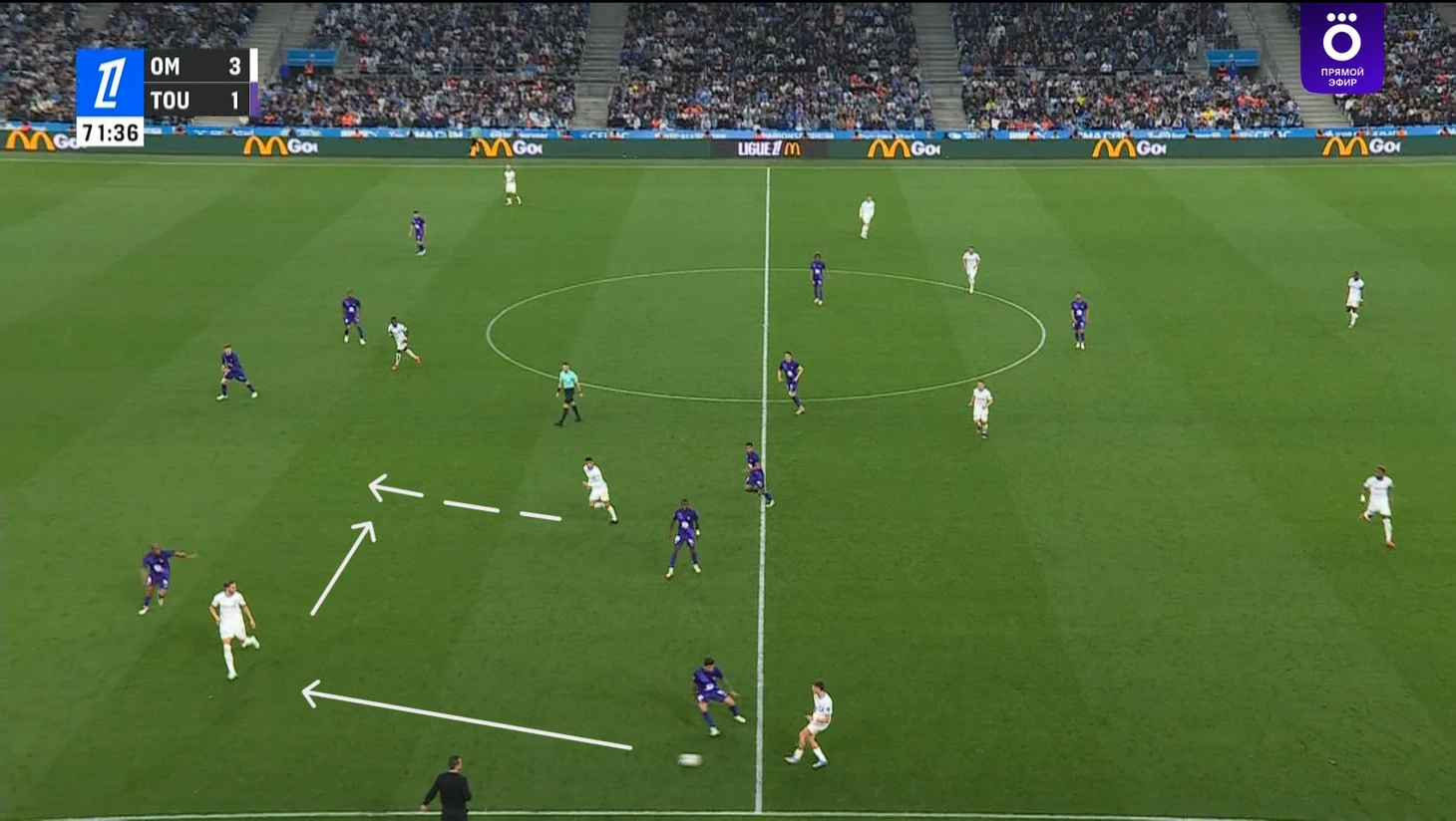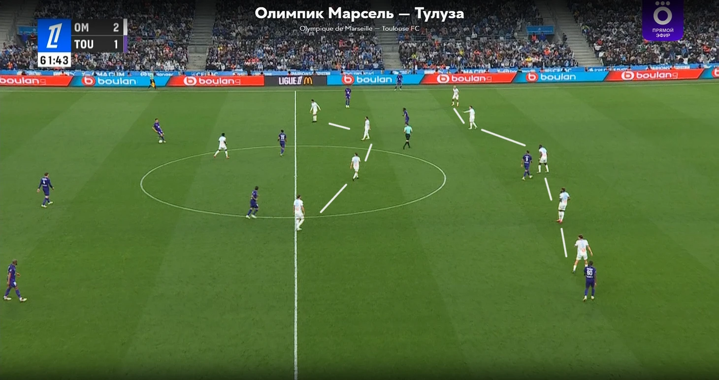 Но все же Тулуза редко допускала такие ситуации, поэтому Марселю часто приходилось атаковать через забросы с флангов, в первом тайме в основном с правого. Во втором тайме чаще всего атаковали с левого. ПЦЗ Мурильо, к слову, тоже сместился налево.