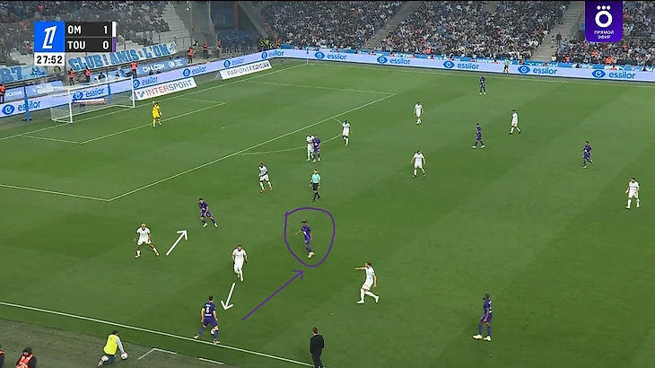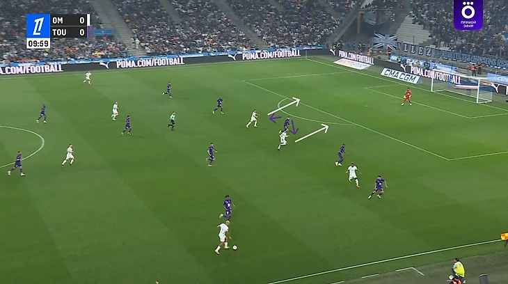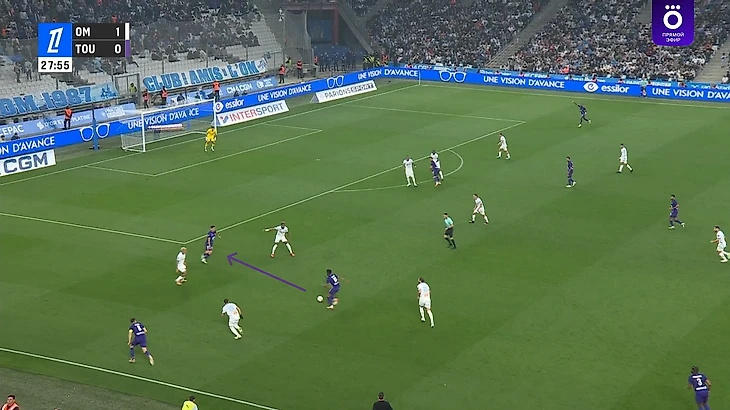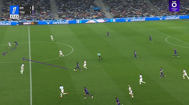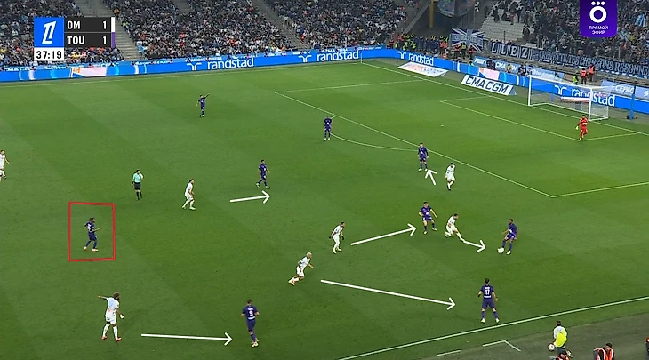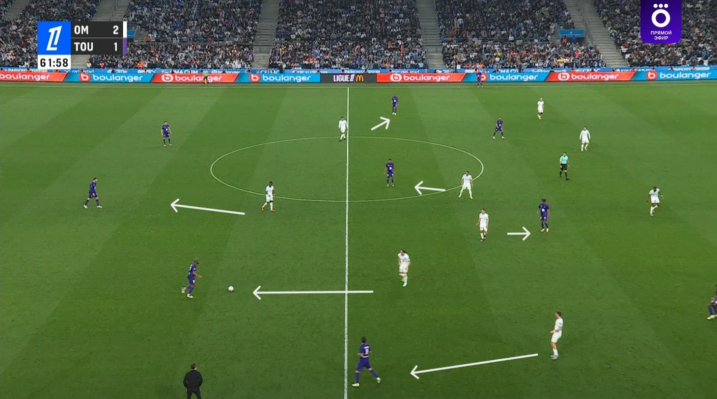 Пусть в атаке Марсель был и неплох, но в обороне часто царила полная неразбериха. Тулуза, игравшая на контратках, пользовалась провалами в обороне и запускала центрфорварда Франка Магри и быстроного вингера Шави Бабику за спины защитников. В этой ситуации Ронжье пошел в неудачный прессинг, а Беннасер побежал его страховать (цифра 2) , как результат — дыра в центре поля. Вдобавок к этому, левый вингер Янн Гбоо опустился в центр, уведя за собой своего опекуна, Амира Мурильо (цифра 1). Это дало еще больше пространства для забегания Магри: