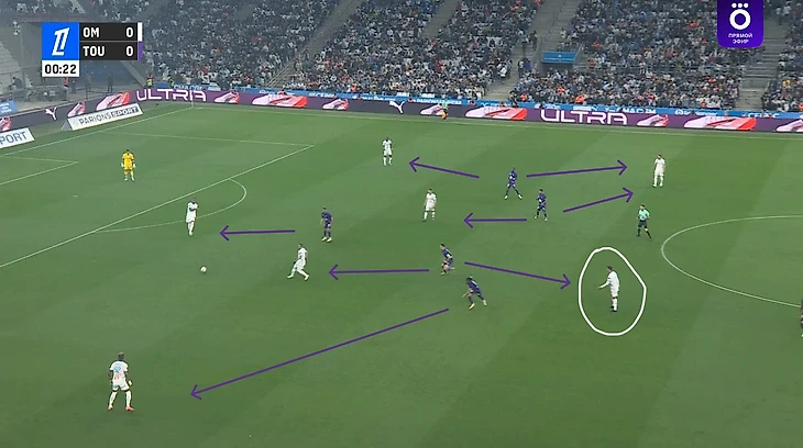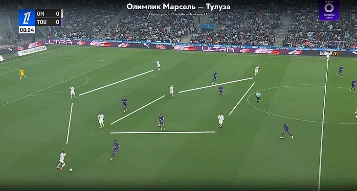 В отличие от более-менее постоянной схемы «Тулузы», расстановка игроков «Марселя» была довольно гибкой. В то время как Адриен Рабьо действовал в основном в левом полуфланге, Мэйсон Гринвуд выдвигался по-сути на позицию «десятки» и искал пространство между линиями. 2 опорника и 2 инсайда формировали такой вот популярный в последнее время четырехугольник в центре: