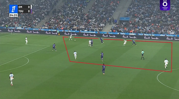 Гринвуд открывался по всей ширине поля, смещаясь на фланги, где «Марсель» пытался создать численное большинство. Вот здесь сформировалась ситуация 5 на 4: