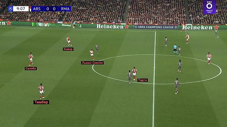 «Арсенал» забрал мяч и неторопливо раскатывал соперника, выстраиваясь в блок 3-2 в первой стадии: Тимбер оставался рядом с ЦЗ, а Льюис-Скелли создавал пару с Парти в середине.