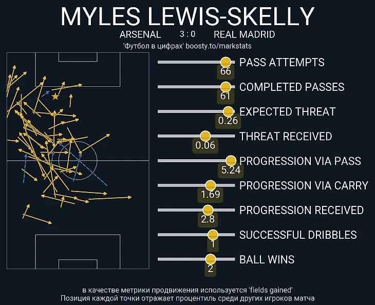После перерыва общая картина не изменилась, а важность Льюиса-Скелли в опорной зоне проявлялась сильнее. Англичанин мастерски распоряжался мячом, быстро переводя атаки и своевременно укрывая корпусом. Защитник стал лучшим по числу продвигающих передач (7) и вторым по ожидаемой угрозе с игры (после Мартинелли).