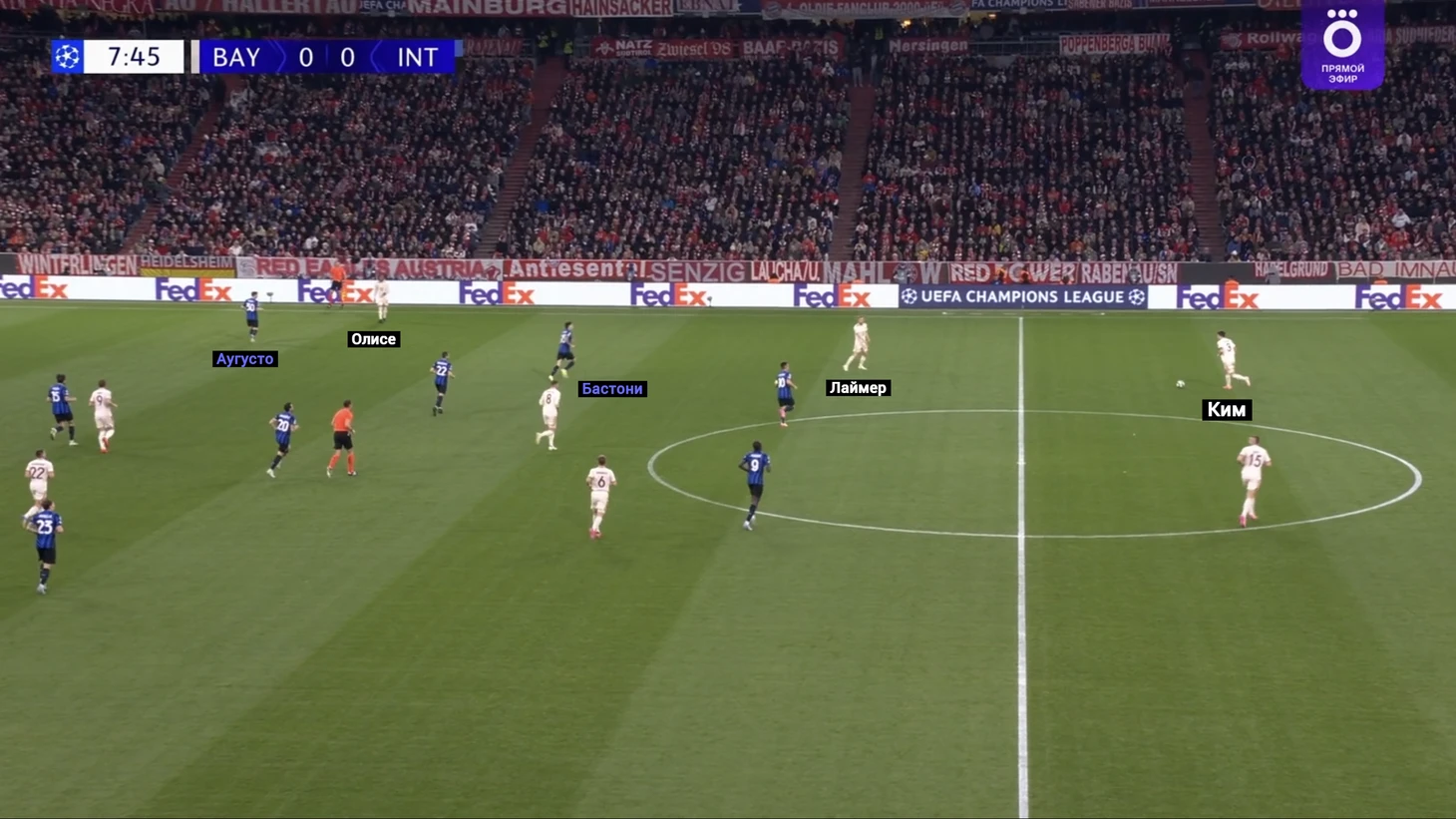 Параллельно с этим опаснее стало и слева - тандем Станишича и Сане сменила связка Лаймер - Гнабри. Ещё в первом тайме «Интер» допускал достаточно моментов, когда на дальней штанге Дармиан оставался против двух соперников.