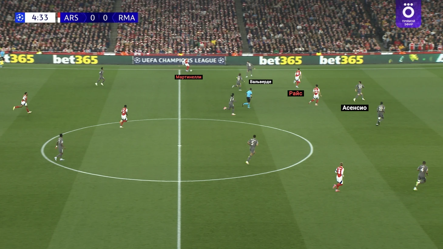 Хозяевам было тяжело создавать моменты через центр, поэтому они быстро переводили мяч с одного фланга на другой и основная угроза шла оттуда. Вначале Сака несколько раз пытался разобраться 1 в 1 с Алабой (было несколько опасных прострелов, но не более). Ближе к середине тайма моменты стали приходить и слева: Мартинелли проходил на дриблинге Вальверде, а если Феде встречал слишком высоко, бразилец подключал Райса, который стабильно атаковал полуфланг.