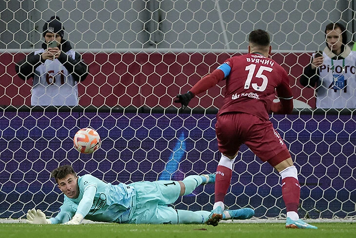В РПЛ Агкацев пропустил только от Лукаса Веры из «Химок» (2:2, не угадал с углом), зато потащил пенальти Мирлинда Даку из «Рубина» осенью при счете 0:1 (дальше команда Мурада Мусаева вырвала ничью) и стал первым вратарем чемпионата России, отразившим удар Николая Калинского из «Нижнего» (его единственный нереализованный пенальти – выше ворот в 2021-м, далее был точен 12 раз).