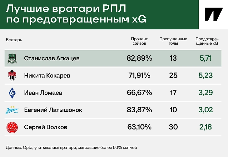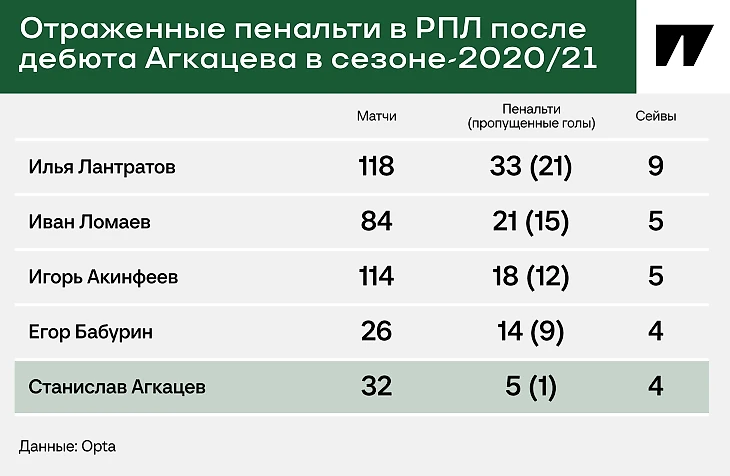 За 32 матча в РПЛ Агкацев отразил 4 пенальти из 5 – например, столько же отбил Сафонов, при этом пропустивший 20 голов с точки.