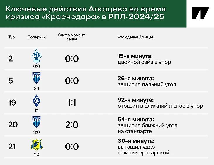 Агкацев – звезда «Краснодара»-2024/25. Полностью заменил Сафонова, осенью внес большой вклад в одиннадцатиматчевую победную серию (важные сэйвы в равных матчах с «Ростовом», «Динамо» и никаких привозов в топ-матчах), весной выручал против «Крыльев», «Нижнего» и «Ростова».