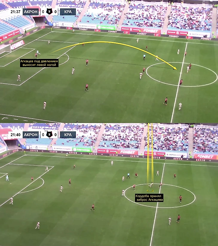 Например, он помог разобрать «Спартак» в первом круге (3:0). Агкацев и центральные защитники далеко не всегда рисковали под прессингом, поэтому его разнообразные передачи на Джона Кордобу стали ключевыми в победе.