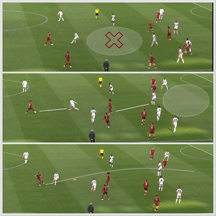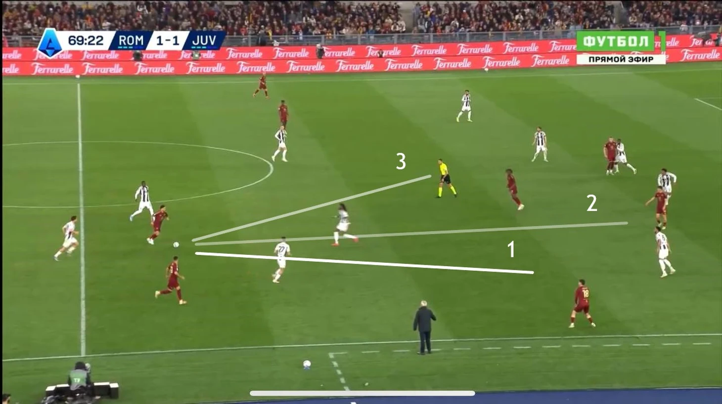 Леандро помогает «Роме» получить свободного игрока на фланге при начале атаки. В первом случает это Анхелиньо, во втором Челик (справа на фото).