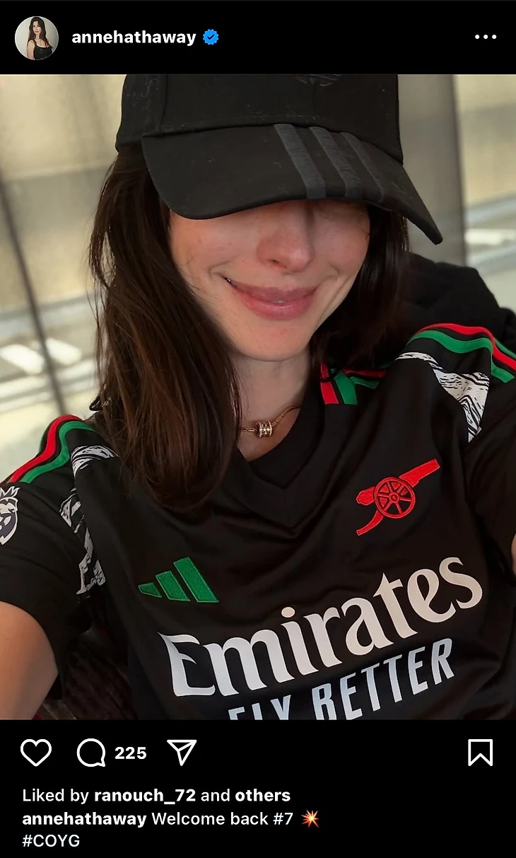 Энн Хэтэуэй болеет за «Арсенал», актриса следит за результатами любимой команды даже в рабочее время. Год назад вместе с партнером по фильму «Мысль о тебе» Энн прямо на интервью радовалась голу Троссарда.