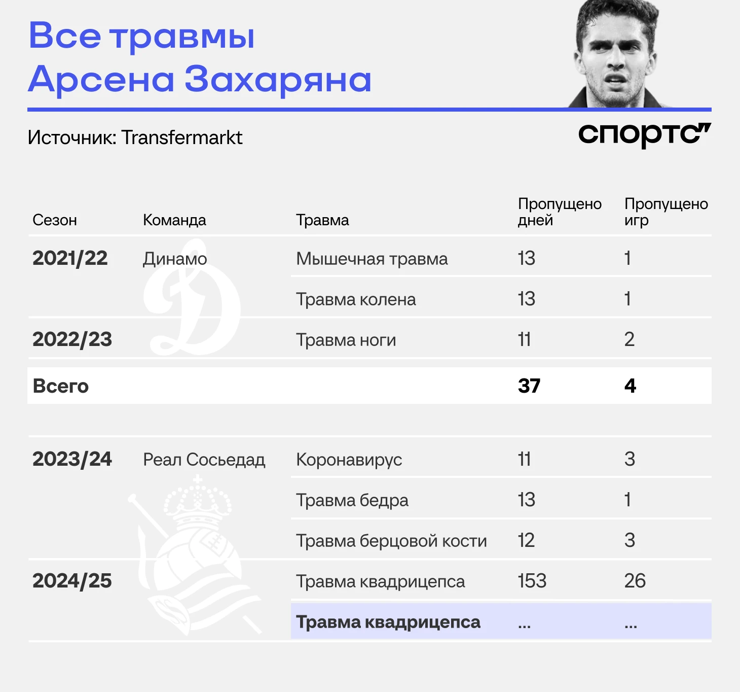 Арсен не страдал из-за травм в России: за два года пропустил из-за здоровья всего четыре матча во всех турнирах, самый долгий вылет – на 13 дней. Захарян много играл в «Динамо», в первом сезоне за «Сосьедад» тоже получал немало минут, но сейчас здоровье вдруг подводит.
