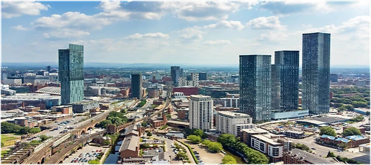 Динсгейт-сквер (Справа) строительство велось с 2016 по 2022 год , представляет собой жилой комплекс небоскрёбов на южной окраине центра Манчестера, Англия, состоящий из четырёх башен, самая высокая из которых имеет высоту 201 метр.