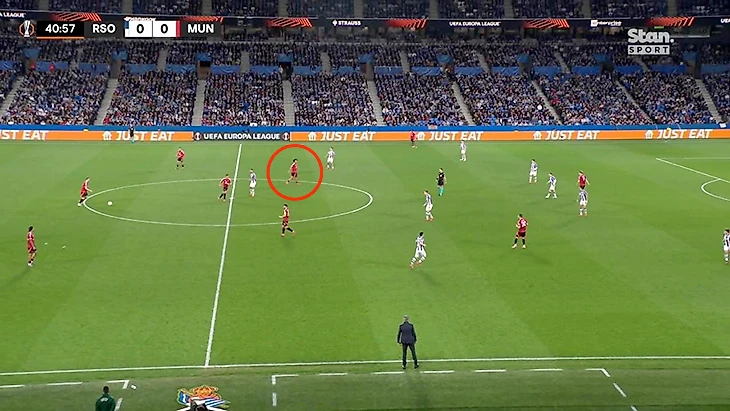 Его позиция без мяча – слева в атакующей тройке. Ничего необычного для этой схемы. А вот при владении – свободная роль, которая ближе к полузащите, чем к атаке. По средней позиции в матчах против «Сосьедада» он оказывался на одной линии с Бруну.