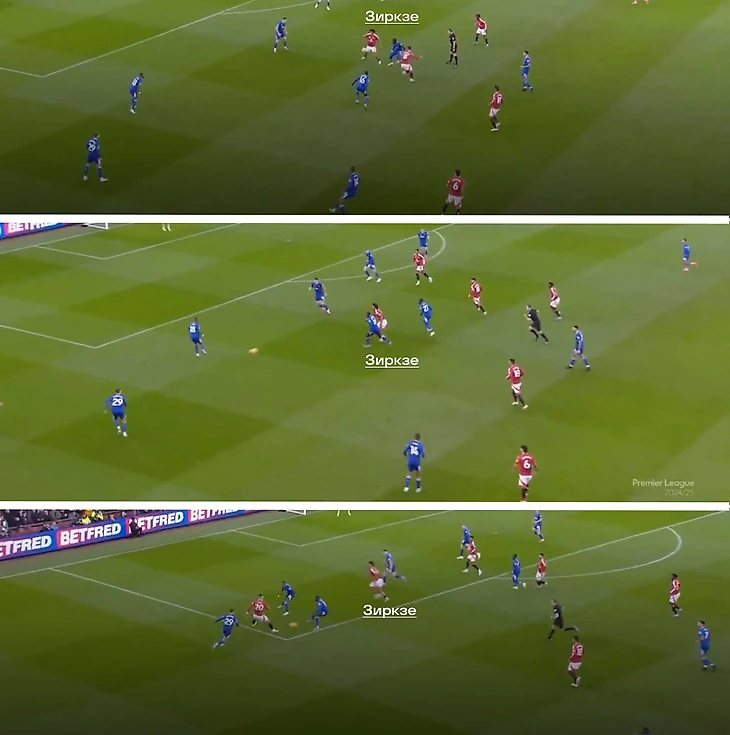 Так сложилось, что в «МЮ» Аморима только Зиркзе способен цепляться за дальние выносы Онана под прессингом соперника. При этом хорошо выигрывает подборы и у своих ворот. Он здорово оттягивает на себя защитников, без проблем разворачивается с мячом после приема и разгоняет игру.
