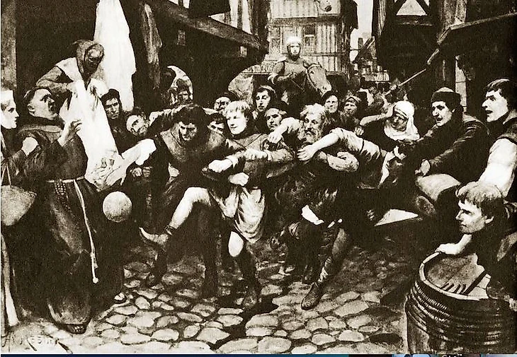 «Футболисты» порой сходились деревня на деревню, и такие матчи иногда заканчивались человеческими жертвами и беспорядками. В 1541 г. (где-то между пятой и шестой женой) во имя поддержания общественного порядка Генрих запретил футбол в Англии.