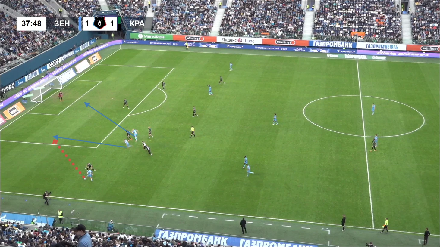 67-й номер сине-бело-голубых опасен своими открываниями между линий – если Максим получает мячи, соперники не успевают его накрыть и следует либо удар, либо проникающая передача. В эпизоде с пропущенным система «Краснодара» дала сбой – Кривцов, номинальная «восьмерка», выдвинулся в давление, оголив свой слот опорной зоны, куда открылся Глушенков и после получения мяча сразу же нанес удар, а на добивание успел Мостовой.