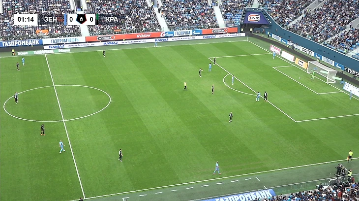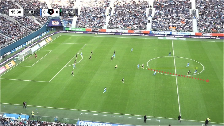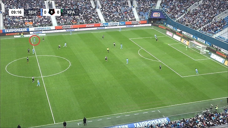 По языку тела игроков «Зенита» было понятно, что игроки этого не ожидали: Латышонок и тройка центральных защитников выводили мяч через длинные передачи, в роли таргетмэна выступал Луис Энрике.