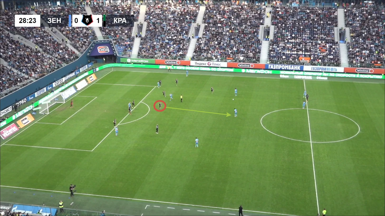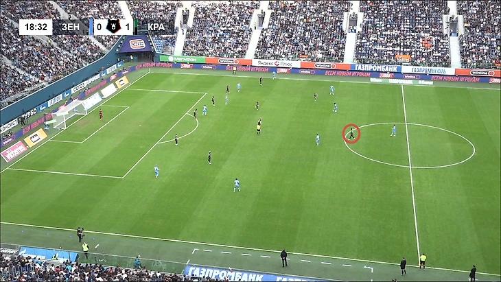 В первые 25 минут «Зенит» мало что мог предложить в позиционной атаке, кроме обыгрышей 1 в 1 с последующей подачей от Мостового и Мантуана. Глушенков действовал в роли свободного художника, но за счет опусканий в линию Батчи оказывался под опекой одного из центральных защитников. Все пошло не так через несколько атак.