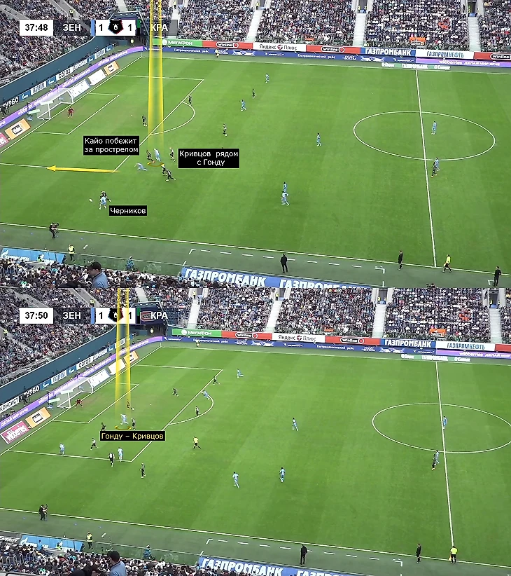 – Перед голом Андрея Мостового огромная дыра в опорной зоне: Черников свалился левее из-за эпизода, Кривцов выдернулся к Венделу – и рядом с Максимом Глушенковым никого. Беда и в том, что защитники не ломали линию: левый защитник Лукас Оласа отпустил Глушенкова, Кайо не стал выдергиваться.