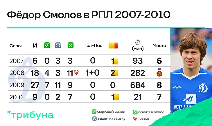 Никто не вернется в 2007? Федору Смолову, возможно, тоже не стоит возвращаться, хотя именно тогда, в весенний апрельский день, 28 числа, он дебютировал в премьер-лиге в далеком Владивостоке, выйдя на одну минуту в матче с «Лучом-Энергия». В тот день футболист стал самым молодым дебютантом «Динамо» в чемпионатах России. На момент выхода на поле Фёдору было 17 лет, 2 месяца и 19 дней.
