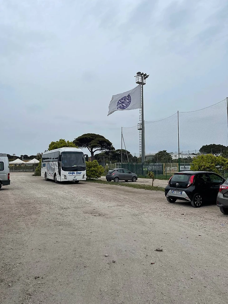 Когда я выходил из дома, погода в Риме была очень комфортная. Но Остия, памятую о моей к ней нелюбви, встретила тучами, противной моросью и сильным ветром с моря. Из электрички выбегал с очень кислым лицом, еще и на матч опаздывал из-за классических итальянских задержек поездов. Хорошо, что стадион от станции находится буквально в пяти минутах. Быстро добежал, купил билет за 10 евро и даже осталось немного времени до начала игры, чтобы выпить кофе и осмотреться.