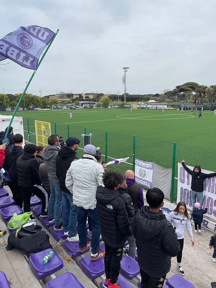 Я пошел на дальнюю трибуну, где располагаются фанаты хозяев. Приободрившись после сцены в баре, сразу полез поближе к той части, где стояли активные тифози. Пытался заряжать вместе с ними, иногда не мог разобрать какие-то слова, но люди вокруг подсказывали. Приятно удивило, что у «Остиамаре» есть ультрас с заводящими, флагами и баннерами, которые на протяжении всего матча неплохо поддерживали свою команду.