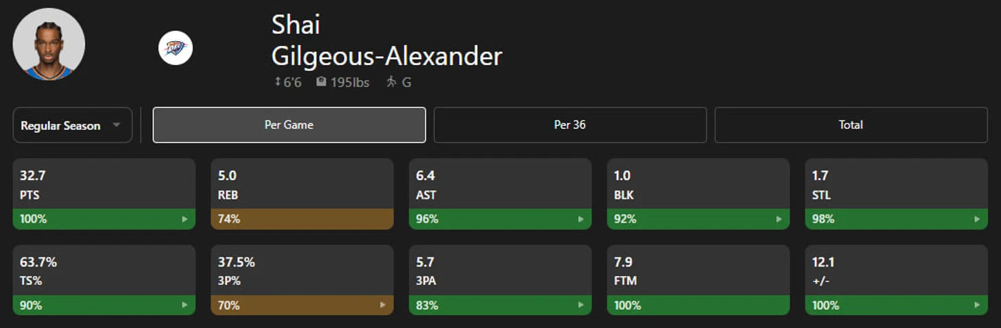 Чтобы было наглядно видно, насколько ШГА доминировал над лигой в этом году в плане набирания очков вот вам интересный факт: у лидера «Оклы» больше всего 20-очковых (75!), 30-очковых (49), 40-очковых (13) и 50-очковых перфомансов, а его серия в 72 подряд игры с 20+ очками стала рекордной в истории НБА, сместив с трона прежнее достижение самого Майкла Джордана.