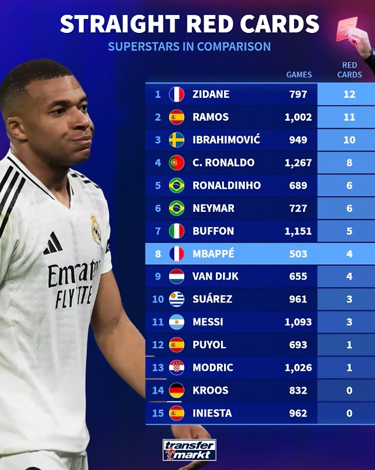 И тут сюрприз: первое место занимает Зинедин Зидан — легенда завершил карьеру удалением на финале ЧМ-2006 и всего насобирал 12 красных в 797 матчах.