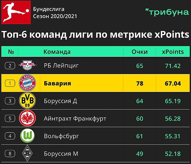Бавария под руководством Ханса-Дитера Флика представлялась грозной машиной, хоть и вылетела в ¼ финала Лиги Чемпионов. Роберт Левандовски, даже несмотря на пропуск нескольких игр, умудрился побить рекорд Герда Мюллера и забить 41 гол за сезон в чемпионате. Казалось бы, какие могут быть проблемы у «мюнхенцев» в своей лиге? Оказывается, все было далеко не так уж гладко. По метрике xPoints «Бавария» должна была занять лишь второе место, уступив чемпионство «РБ Лейпцигу».