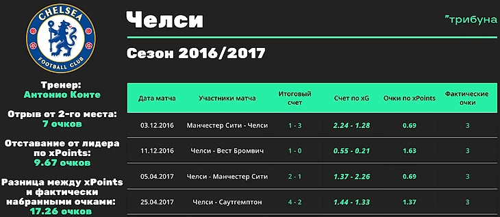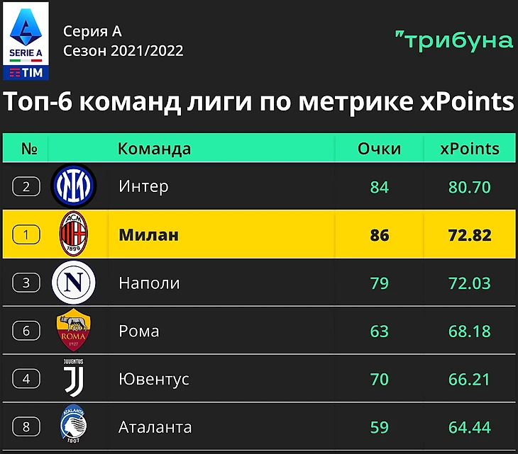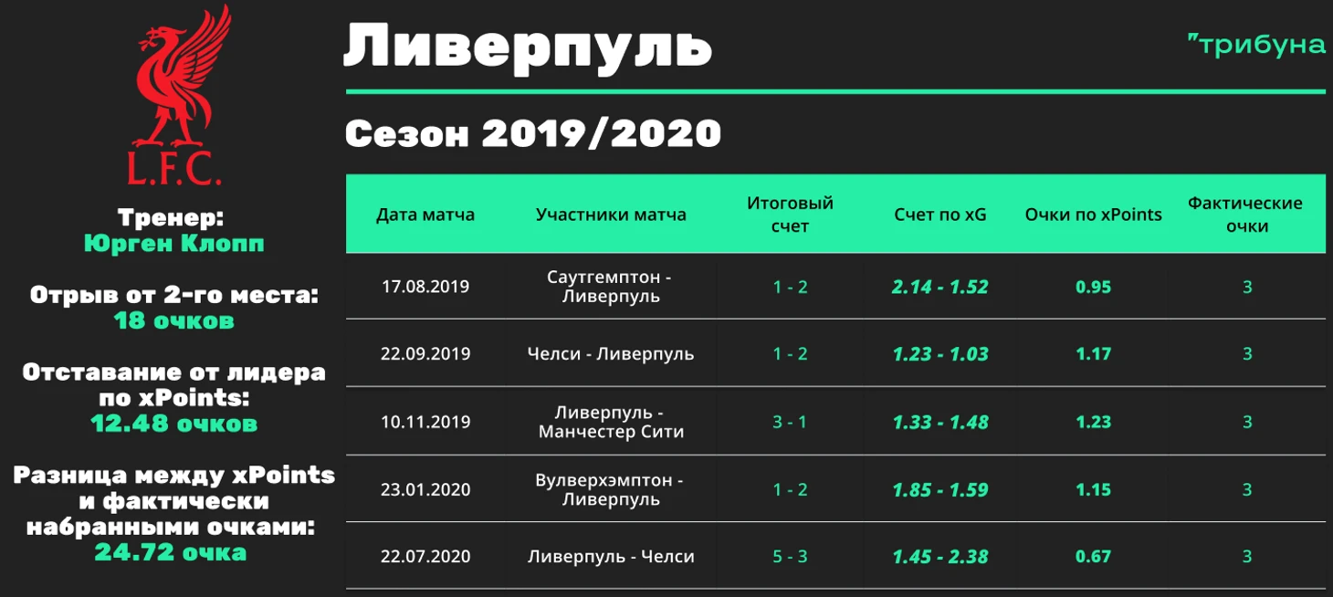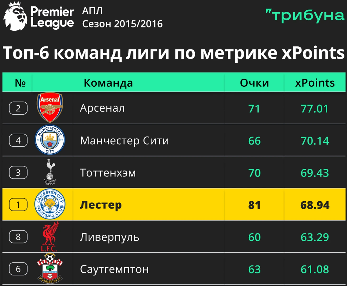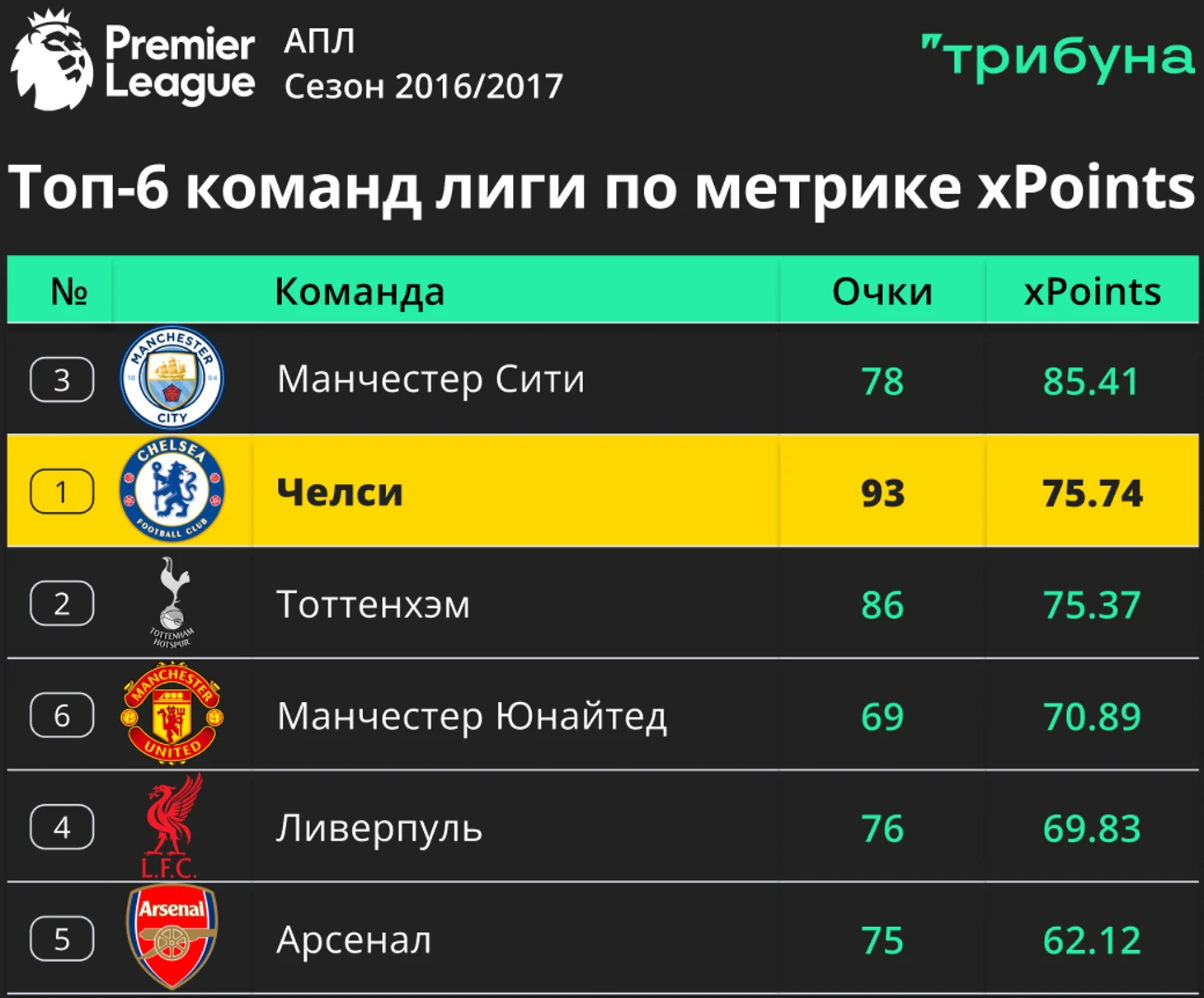 Приличная разница в значении xPoints с «Манчестер Сити» (12.48 очков) и огромная разница (24.72 очка) между xPoints и кол-вом фактически набранных очков.