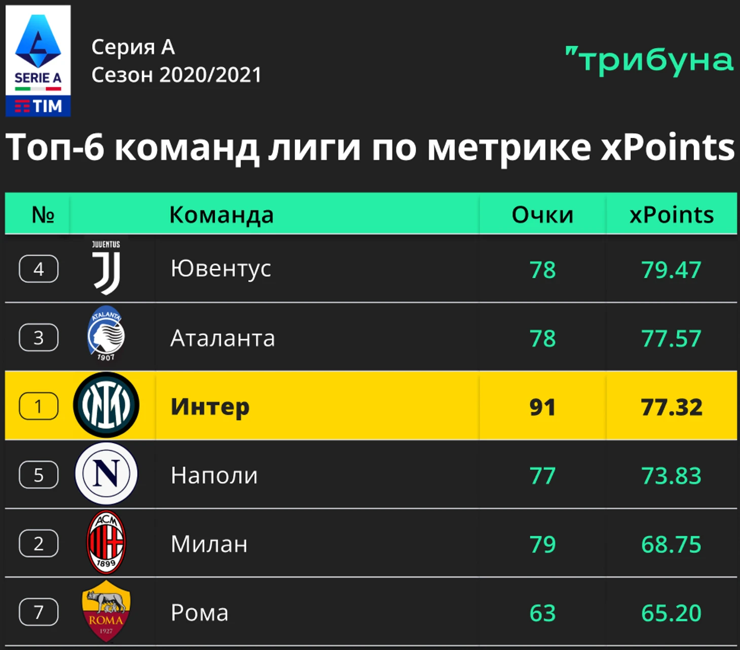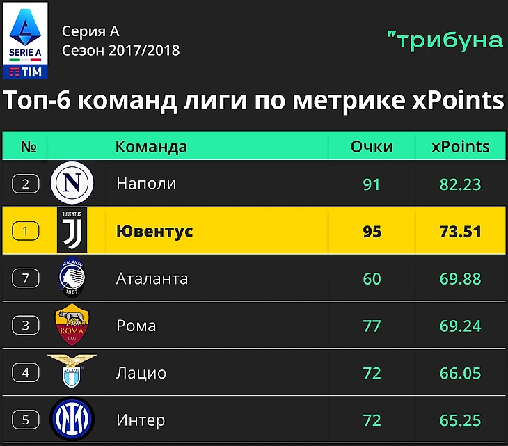 «Ювентус» отстал от лидера по итогу сезона всего-то на 8.72 очков. Разница между xPoints и фактическими результатами в турнирной таблице составила 21.49 очко – это очень много.