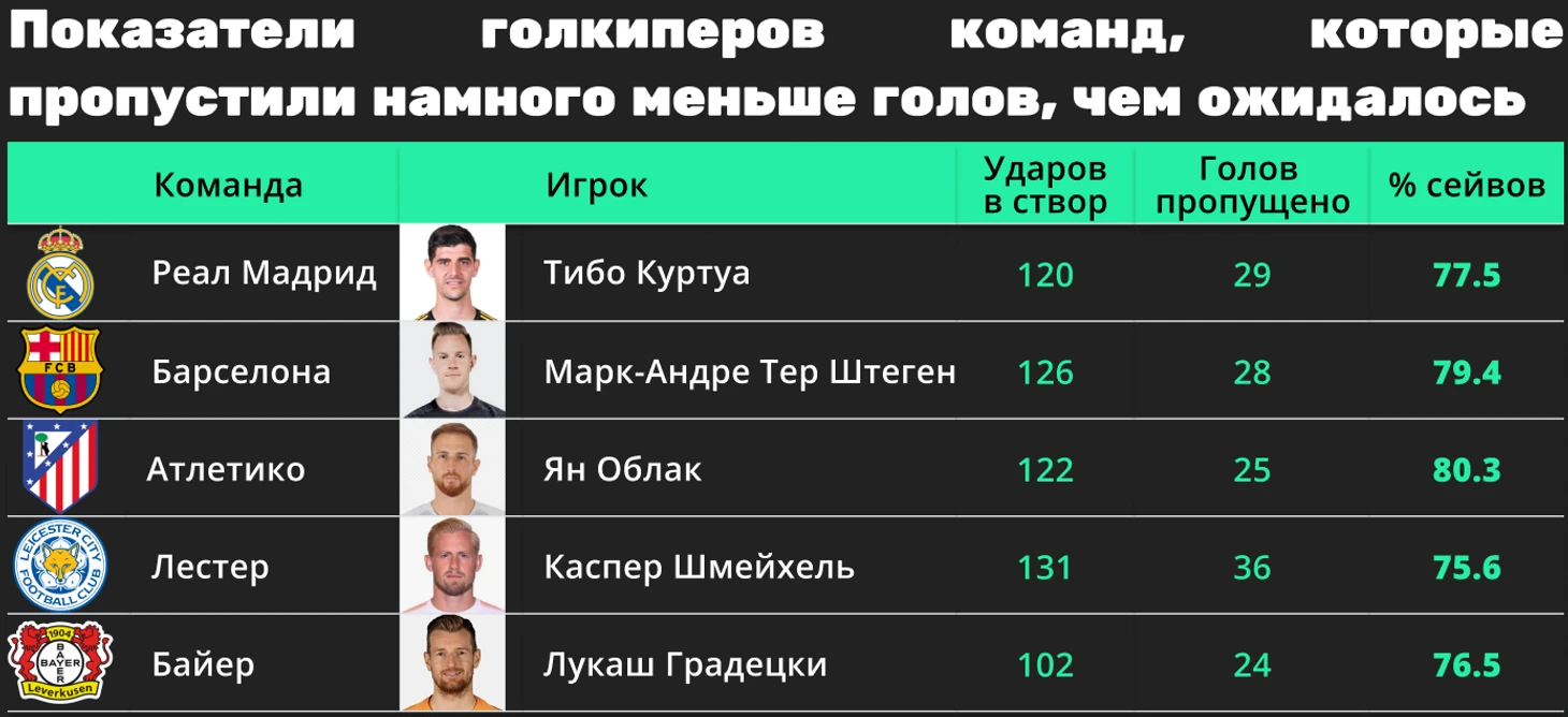 Реализация «Реал Мадрида» в этом сезоне слегка сбоит (на 1.8 голов забито меньше, чем ожидалось), а вот кол-во пропущенных мячей аж на 15.5 меньше ожидаемого значения. Это лучший показатель в данном рейтинге среди всех команд. Перфомансы Тибо Куртуа бесспорно оказали серьезное влияние на значение данного показателя.