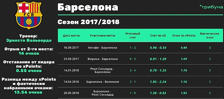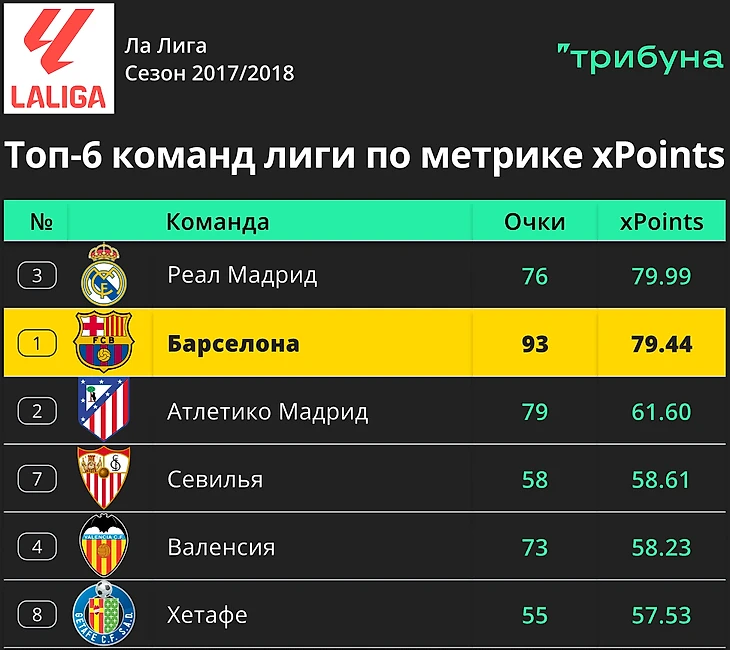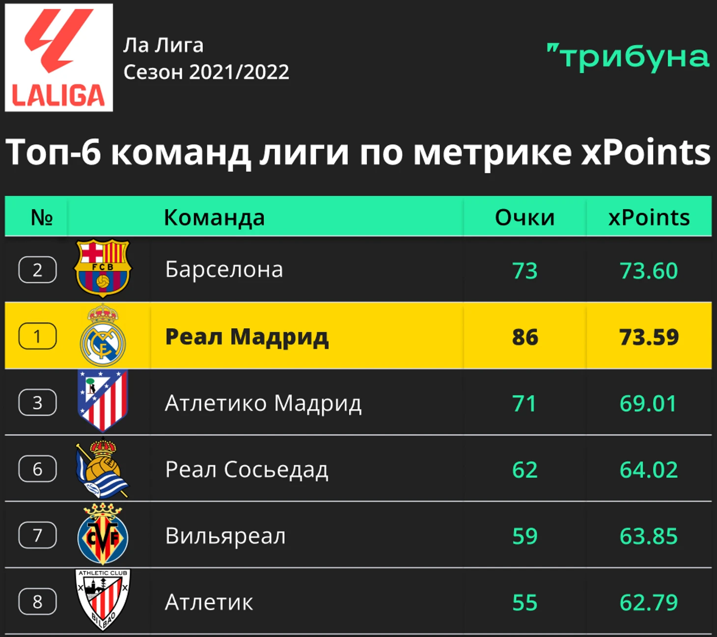 «Реал Мадрид» набрал всего на 0.01 очков меньше, чем «Барселона» по метрике xPoints. Это говорит, что обе команде были одинаково достойны стать чемпионами, но «сливочным» повезло набрать аж на 13 очков больше, чем «сине-гранатовым».