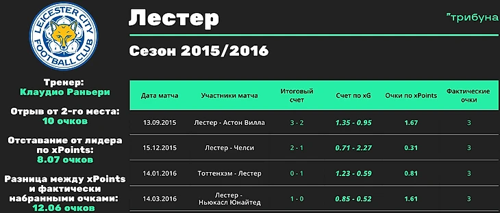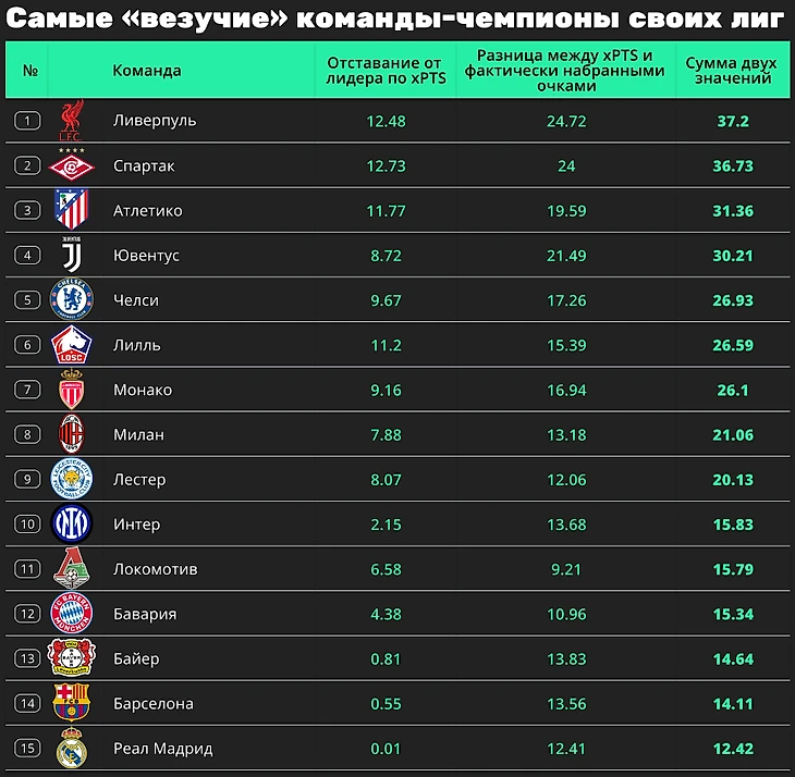 Примечание: у каждой команды в конкретном розыгрыше чемпионата бывают как удачные, так и неудачные матчи. Команды-«аномалии» из нашего списка – это те команды, в сезоне которых удачных стечений обстоятельств случилось значительно больше, чем неудачных.