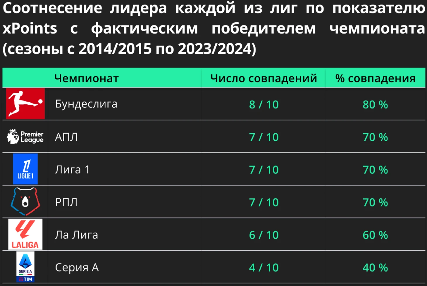 Всего 6 чемпионатов, 10 сезонов, так что максимальное кол-во совпадений фактического чемпиона лиги с победителем по метрике xPoints равняется 60. В нашем случае чемпион подтвердился в xPoints в 39 случаях из 60 возможных или с вероятностью в 65%.