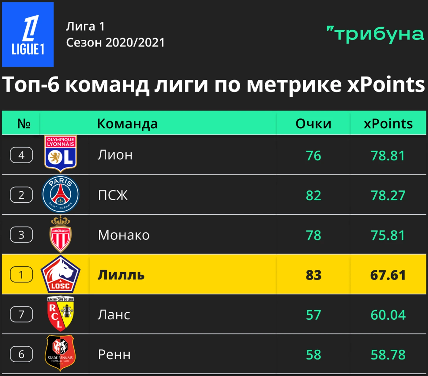 Во французском чемпионате было всего 3 «аномальных» чемпионства. Случай ПСЖ не такой уж интересный, судя по цифрам. Так что рассмотрим только сезон «Лилля» (2020/2021) и «Монако» (2016/2017).