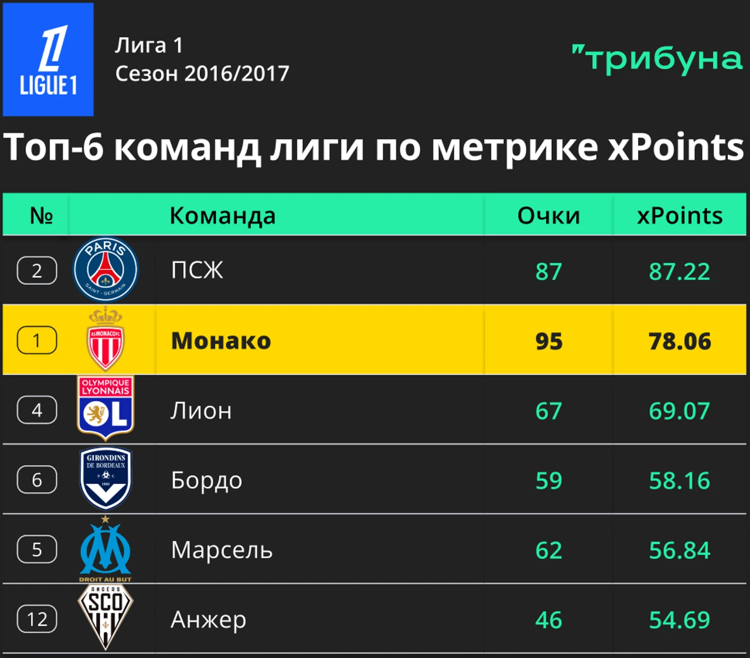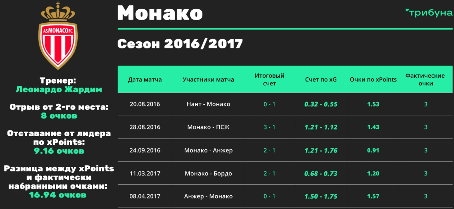 «Монако» отстал от лидера по итогу сезона на 9.16 очков. Разница между xPoints и фактическими результатами в турнирной таблице составила 16.94 очков.